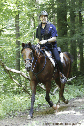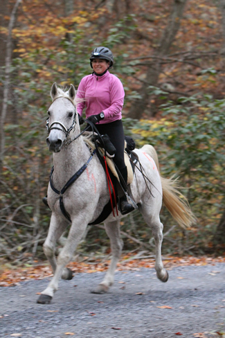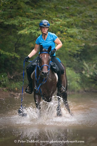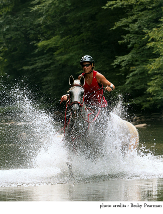 Photo from Cover Endurance News, May 2012 issue: Karen Bell (rider) of North Carolina is on her way to a top ten finish at last September's Canter Over the Mountain ride with her now-10-year-old Arabian gelding Prince Sam. Karen and Sam finished the 50-mile ride, held in West Virginia, in 9:51. Karen has 1,515 endurance and 515 LD miles; Sam has 1,250/55. Photo by Peter DeMott, www.photosbypdemott.com.