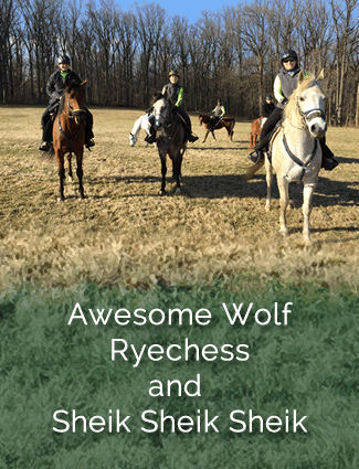 Ryechess is a 2010 grey gelding by Dahess out of Polish Rye- a young horse and mount for junior rider. Sheik is "Sheik Sheik Sheik" by Samsheik and out of the Cre Run mare CR Dasire by Moniet El Nafis. Awesome Wolf is by Nivour De Cardonne and out of Awesome Gal by Asjah Ibn Faleh.