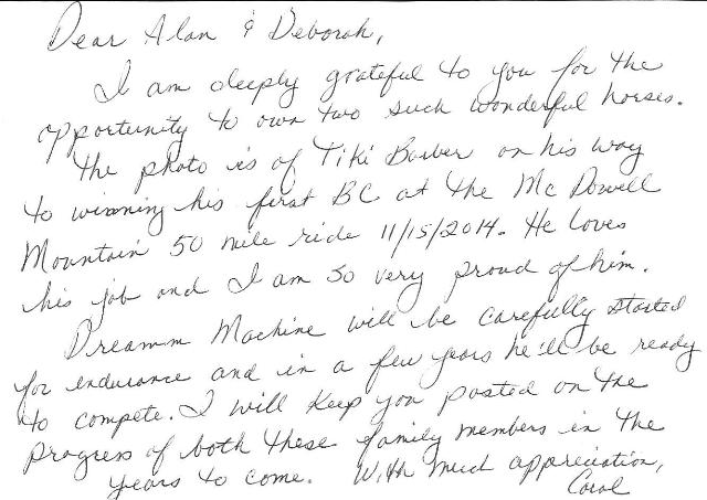 To the left is also the "2nd Annual Christmas" photo sent by owner Carol Fontana, of Tiki Barber on his way to winning his first BC at the McDowell Mountain 50 mile ride 11/15/14. Click here for attachment of Carol's handwritten note. We love these presents!!! Also in the flashing images is Tiki Barber's 1st day "Arrival" photo from 1/31/13. These two have really come a long way and bonded - for sure!