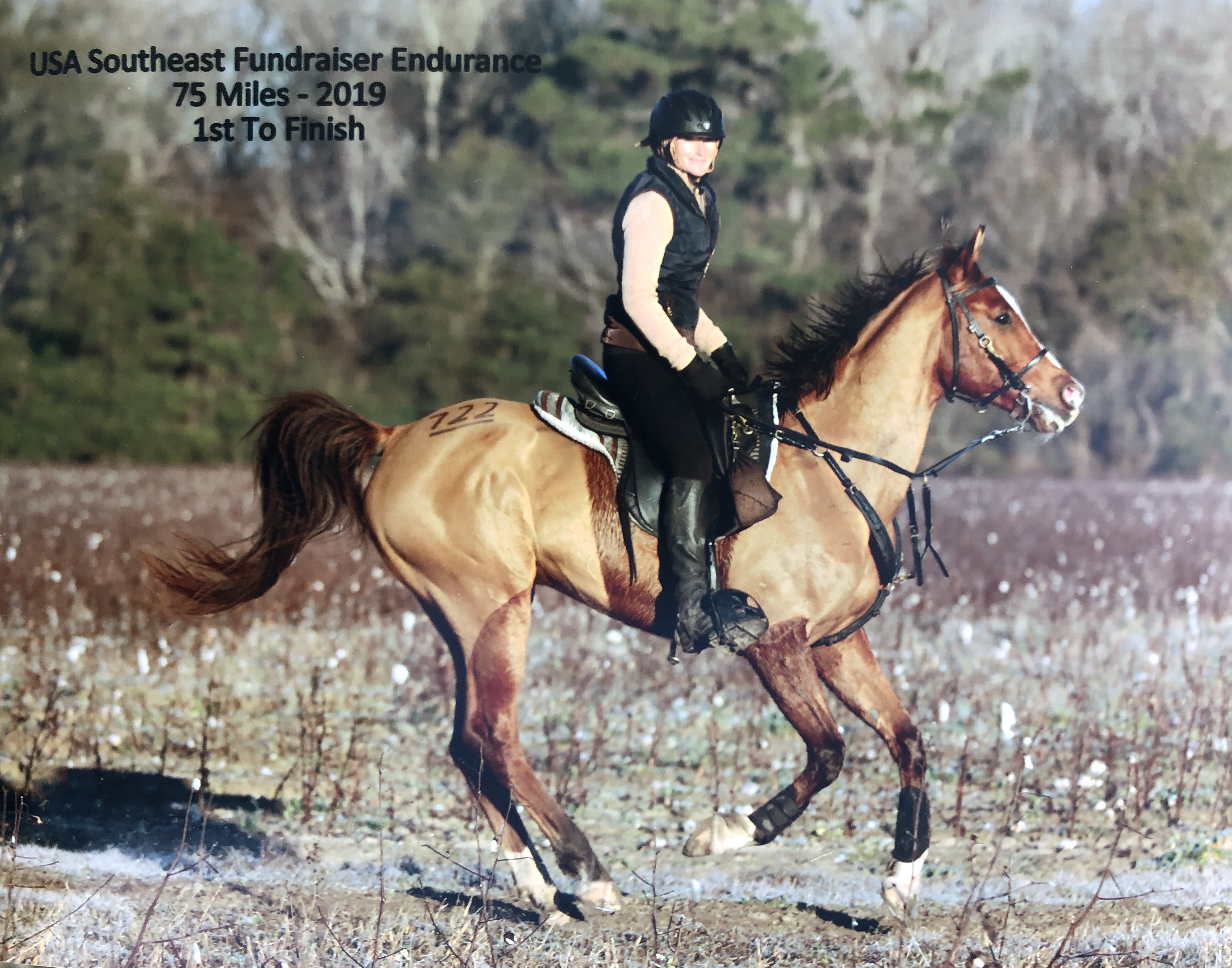 We started dead last as he is not ready for a “hot” start yet and worked our way up/ short and steep hills with little in the way for a big horse to gain an advantage, but when we did find flat ground he flew. Some of the climbs were so steep I was standing leaning way forward and his breast collar was so tight you couldn’t get a finger under it. Then down the other side much like a roller coaster. Dr Dwayne Barnett vetted him out and his back was perfect all A’s too.